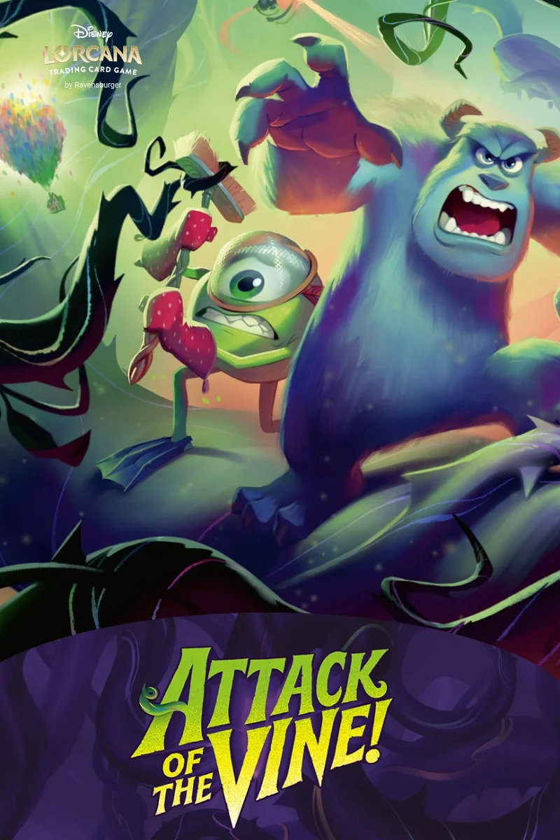 Something is growing in the Great Illuminary — and it's spreading fast! Attack of the Vine unleashes two brand-new Pixar franchises on Disney Lorcana: the loveable monsters of Monsters, Inc. with Sulley and Mike Wazowski facing vineling threats, and the unforgettable adventure of Up. Returning fan favourite Turning Red brings Mei back to the inklands as thorny vines twist and tangle across the thirteenth chapter of Disney Lorcana.